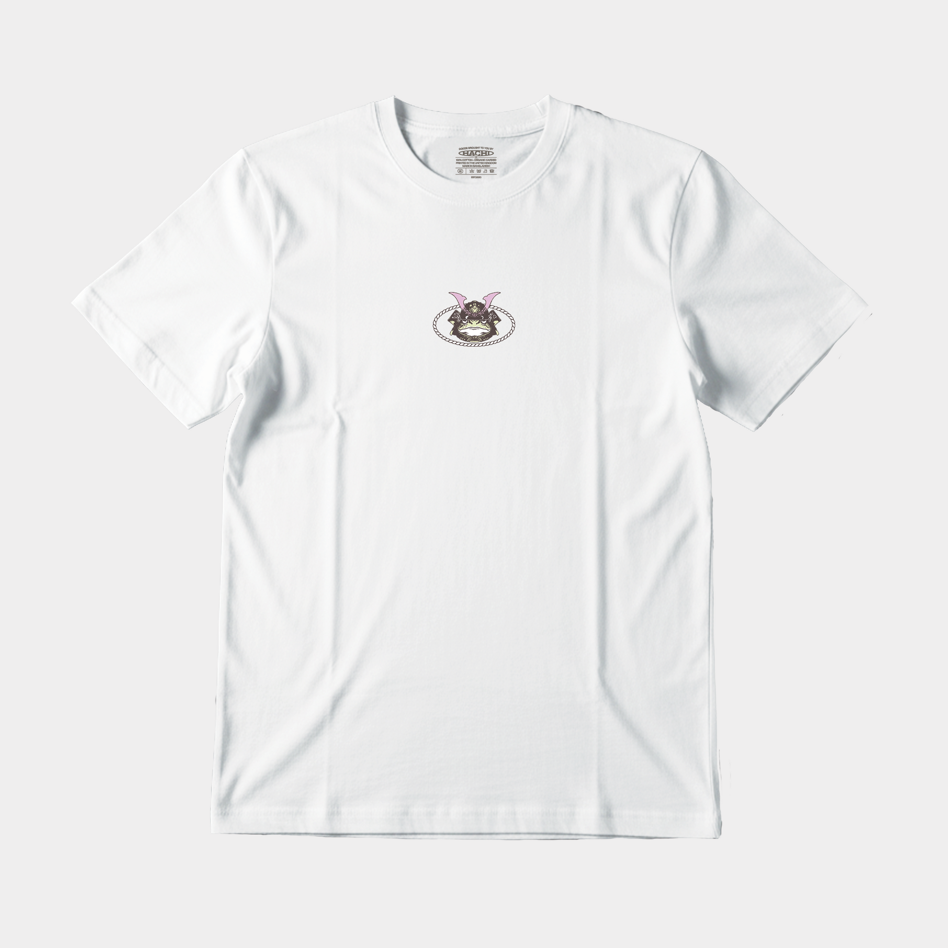 White unisex oversized fit with print on the front, back and neck set-in sleeve, 1x1 rib at neck collar inside back neck tape in self-fabric, sleeve hem and bottom hem with wide double needle topstitch, slightly rougher fabric characteristic.